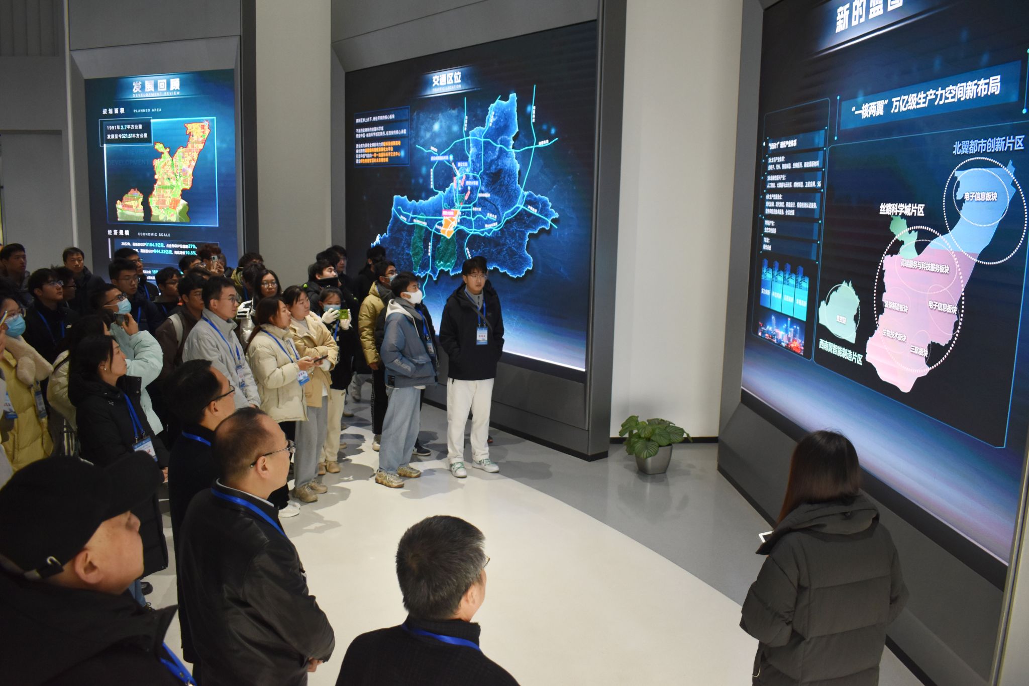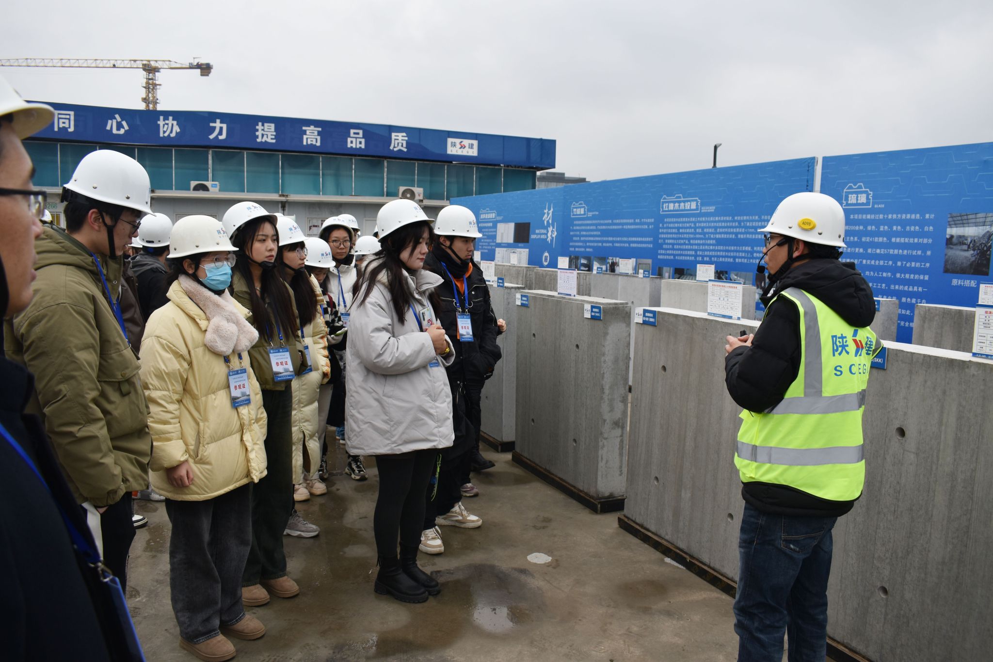 讲解员向研学团介绍西安高新区丝路科学城规划、大剧院特殊工艺和试验试样样品