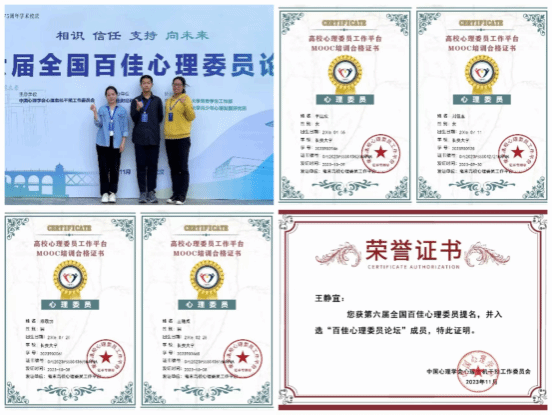 建设队伍提升能力,汇聚心理育人向心力。根据学校相关要求,学院二级心理站设有站长1人、副站长3人,各年级差异化配备心理委员1-2人,结构合理、职责清晰、分工明确。构建校心理中心教师、学院领导、学业导师、思政辅导员、朋辈导师、心理委员、宿舍信息员全方位、立体化的心理育人队伍。同时,注重心理委员的专业技能培训,低年级心理委员均通过了毫末高校心理委员MOOC培训,并获得合格证书;组织全体心理委员及宿舍长参加心理健康团体辅导和心理委员工作技能培训讲座;定期组织开展工作培训,参加心理健康教育专业培训和案例研讨;21级心理委员王静宜同学获得第六届“全国百佳心理委员”入围奖。通过家校沟通实现家校联动,分析研判学生心理特点和问题成因,构建“家校协同”育人机制,共同防范化解学生心理危机。