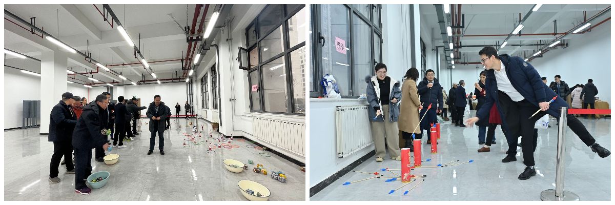 联欢会前,教职工进行游园活动,参与丢沙包、投壶、套圈、踢毽子、夹乒乓球等娱乐活动。