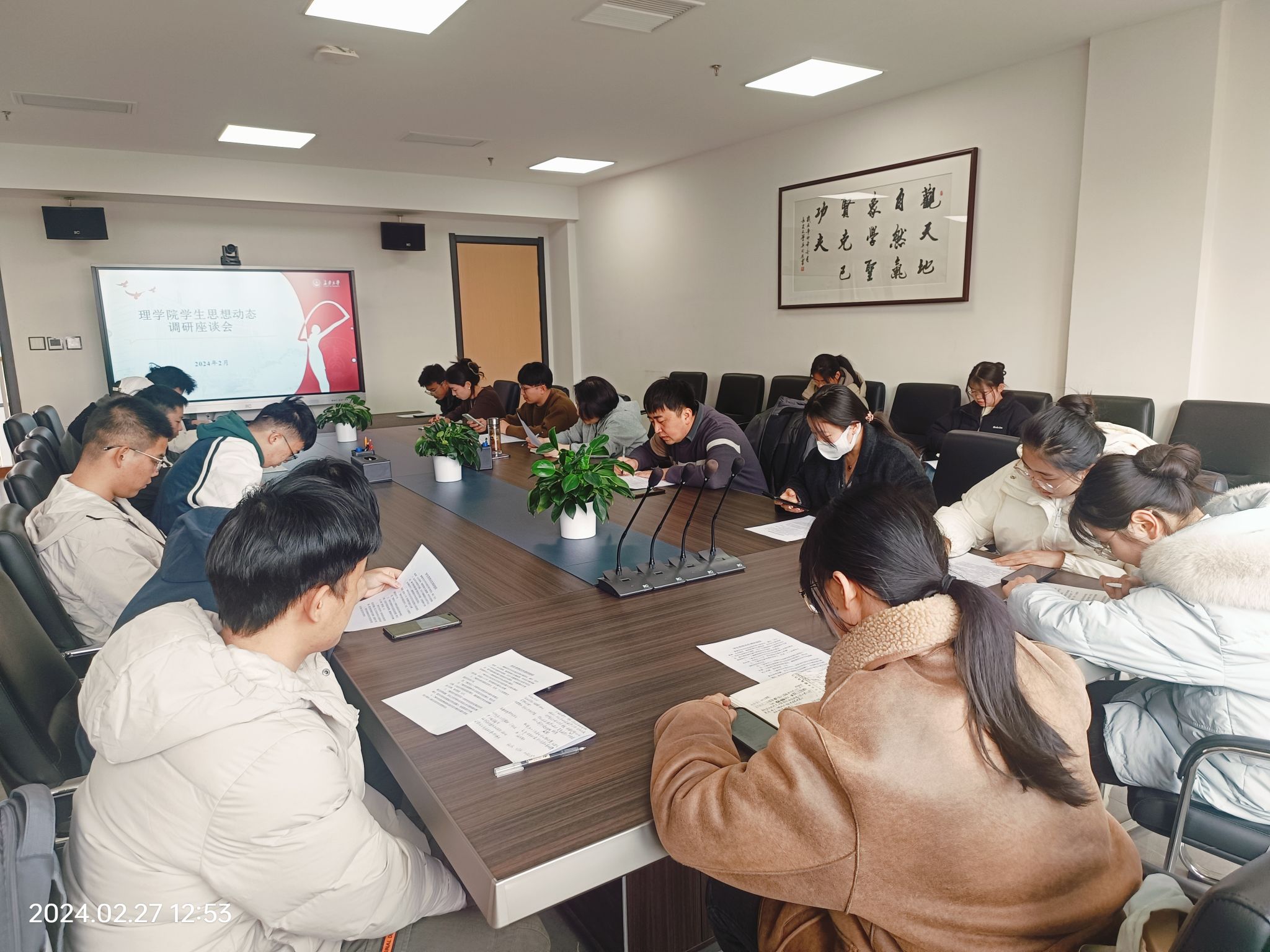 为全面掌握学生思想动态,及时回应学生急难愁盼,进一步提高大学生思想政治教育工作的针对性、实效性和科学性,2月27日,理学院在北校区师生服务大厅第一会议室召开学生思想动态调研座谈会。学院党委副书记屈颖、全体本科生辅导员以及各班级学生代表参加座谈会,会议由学办主任刘延海主持。