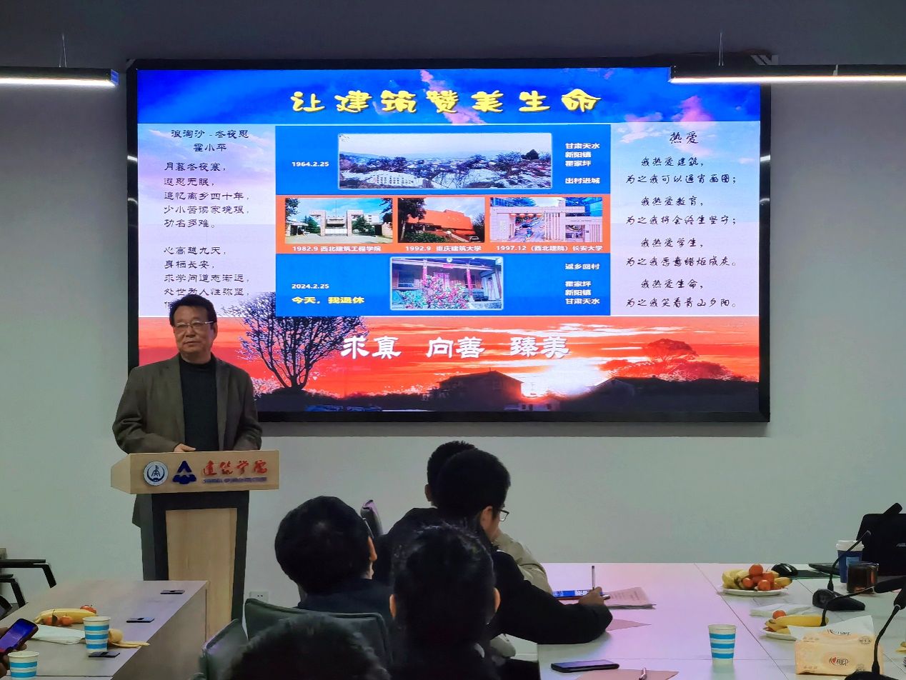 霍小平教授回顾了自己在建筑学院从求学,到教学,再到光荣退休的42年岁月,讲述了学院发展过程中的重大事件。他希望青年教师们能够将个人发展融入到学校及学院的发展中去,将学院良好的精神风貌不断延续下去,并向大家送上“求真、向善、臻美”的寄语,勉励老师们要做学生为学、为事、为人相统一的“大先生”。