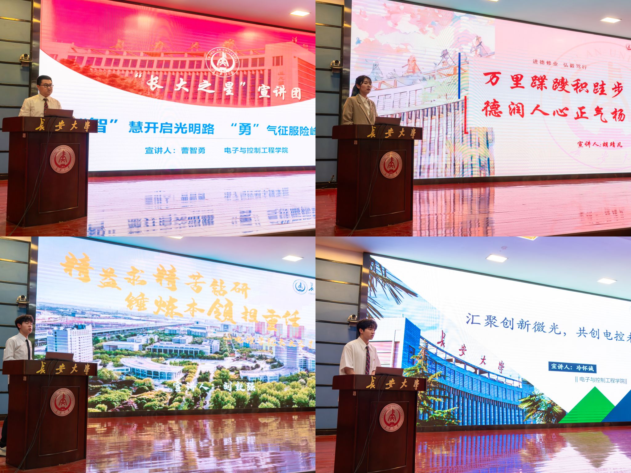 宣讲环节,宣讲团成员曹智勇、胡靖凡、刘敦强、冷怀诚分别围绕课程学习、团学工作、班级建设、科创竞赛等方面进行分享。他们强调了基础课学习的重要性,分享了专业课的有效学习方法、参加科创竞赛的经验体会、如何有效兼顾学习与工作等,激励同学们不畏挑战、勇敢追梦,积极进取、追求卓越。