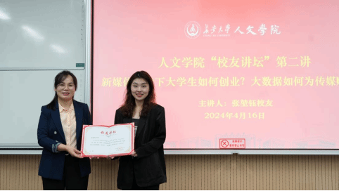 讲坛结束后,何红娟为张堃钰颁发“校友讲坛”留念证书。人文学院将持续同校友保持密切联络,邀请更多不同专业、不同领域的校友来校分享成功经验,为人文学子提供交流提升平台,鼓励学生以优秀校友为榜样,认真学习、健康成长、笃学成才。