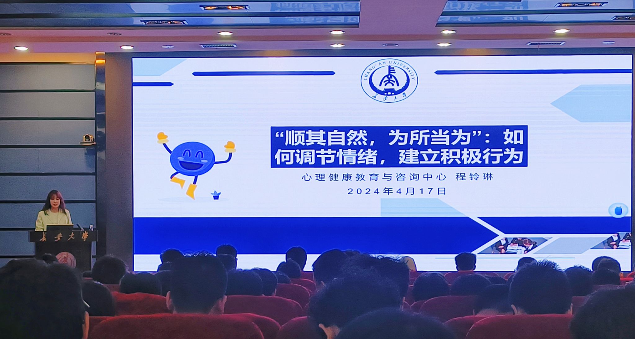 程铃琳以《“顺其自然,为所当为”:如何调节情绪,建立积极行为》为题,从当前大学生感兴趣的MOBA游戏引入,就“感受情绪”“理解情绪”“控制情绪”“行动的勇气”四个方面进行了全面细致的讲解,结合多个鲜活生动的案例,引导同学们正视情绪变化,采取积极行动,从而更好地面对挑战和挫折,拥抱幸福人生。