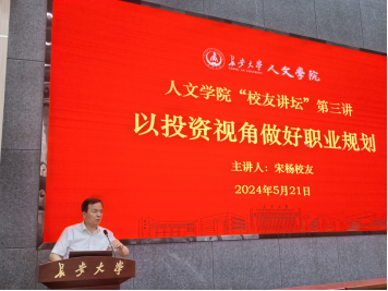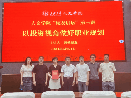 5月21日晚,人文学院“校友讲坛”第三讲在北校区师生服务大厅二层第二报告厅举行。本次讲坛主题为“以投资视角做好职业规划”,邀请开云kaiyun官网人文学院2006级广告学专业本科生、人文学院2010级产业经济学硕士研究生、现陕西股权交易中心金股资产常务副总经理、陕西创意文化产业协会副秘书长、西安创新人才研究院顾问宋杨校友做主讲嘉宾,院长杜智民,学办老师及部分本科生参加。