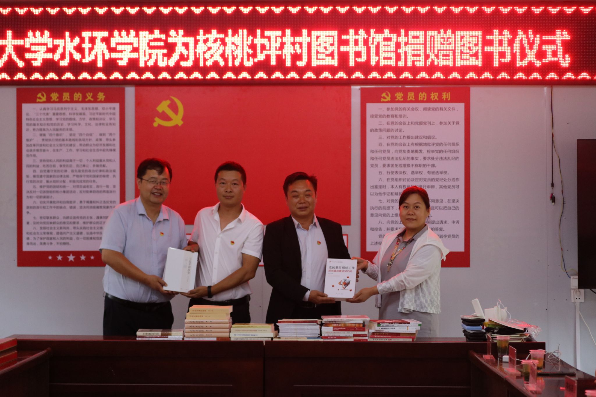 会上举行谈了图书捐赠仪式。张骞文和荆琳代表水环学院党委向核桃坪村图书馆捐赠党纪学习教育的图书60余套,此次捐赠是学院党委组织的第三次捐赠图书活动,截止目前总计向村里捐赠图书600余套,持续充实村图书馆的图文资料,不断丰富村民文化生活。
