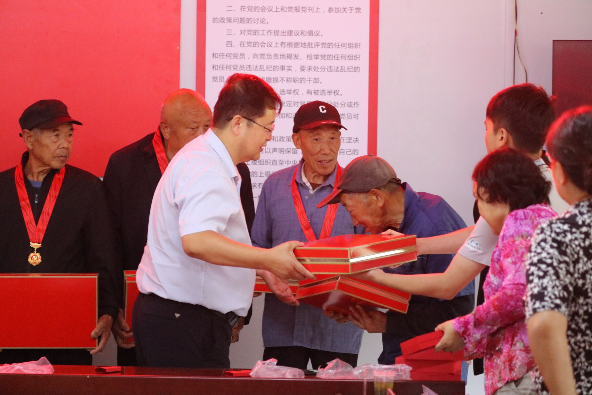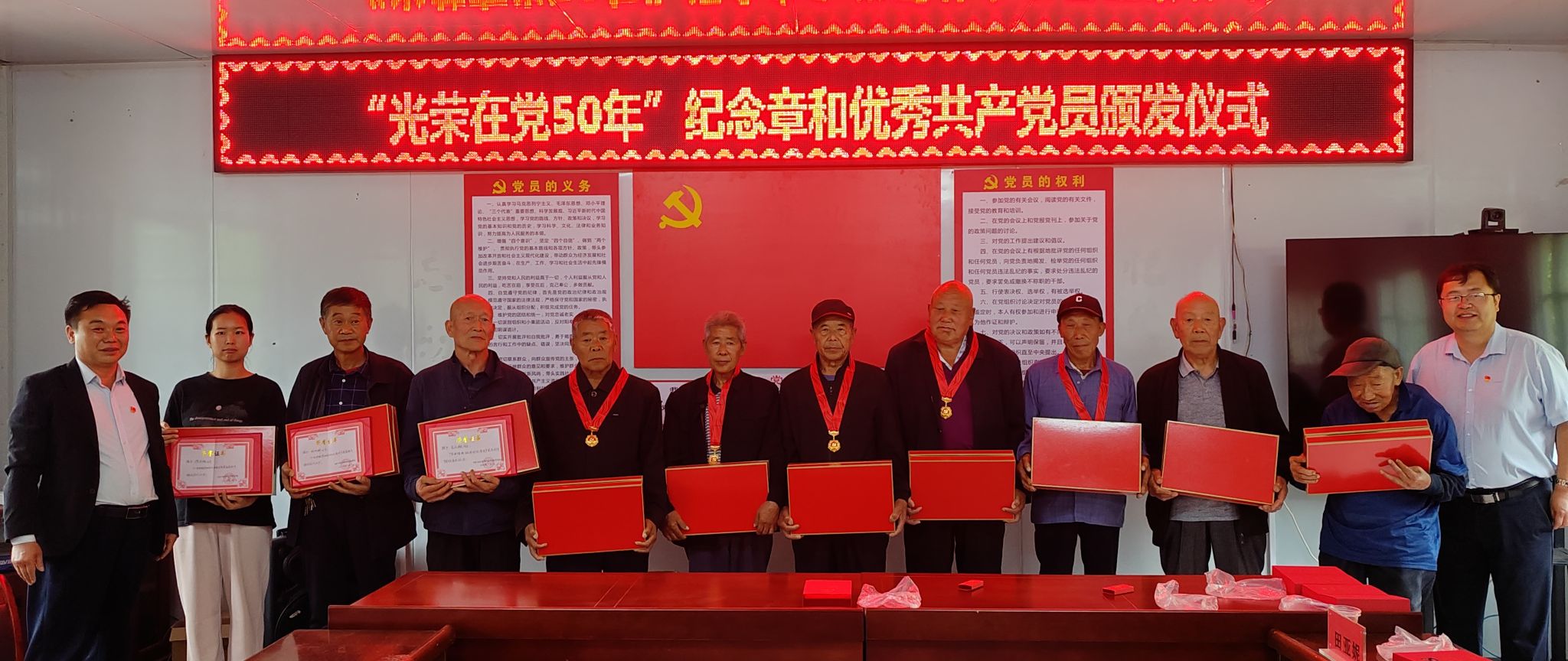 会上,举行“光荣在党50年”纪念章颁发仪式,张骞文和张瑞分别为村里10名荣获奖章的老党员逐一佩戴纪念章、发放纪念品,并向荣获奖章的老党员表示热烈的祝贺和崇高的敬意。在张骞文的带领下,全体参会党员面对鲜红党旗,庄严宣誓,重温入党誓词。