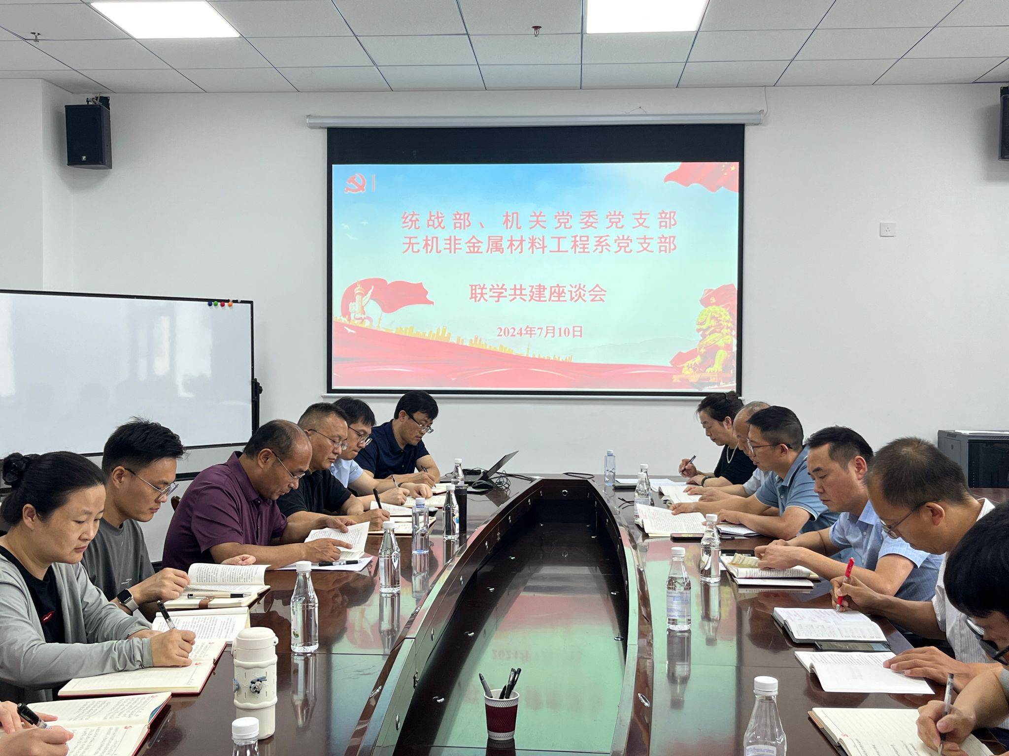 7月10日下午,统战部、机关党委党支部与无机非金属材料工程系党支部在材料科学与工程学院第一会议室开展了联学共建活动。统战部部长石松、机关党委副书记魏立明、材料科学与工程学院党委书记王振军以及两个共建支部全体党员参加活动。本次活动的主题是《习近平关于全面加强党的纪律建设论述摘编》联学与党支部共建,联学活动由统战部部长石松主持。