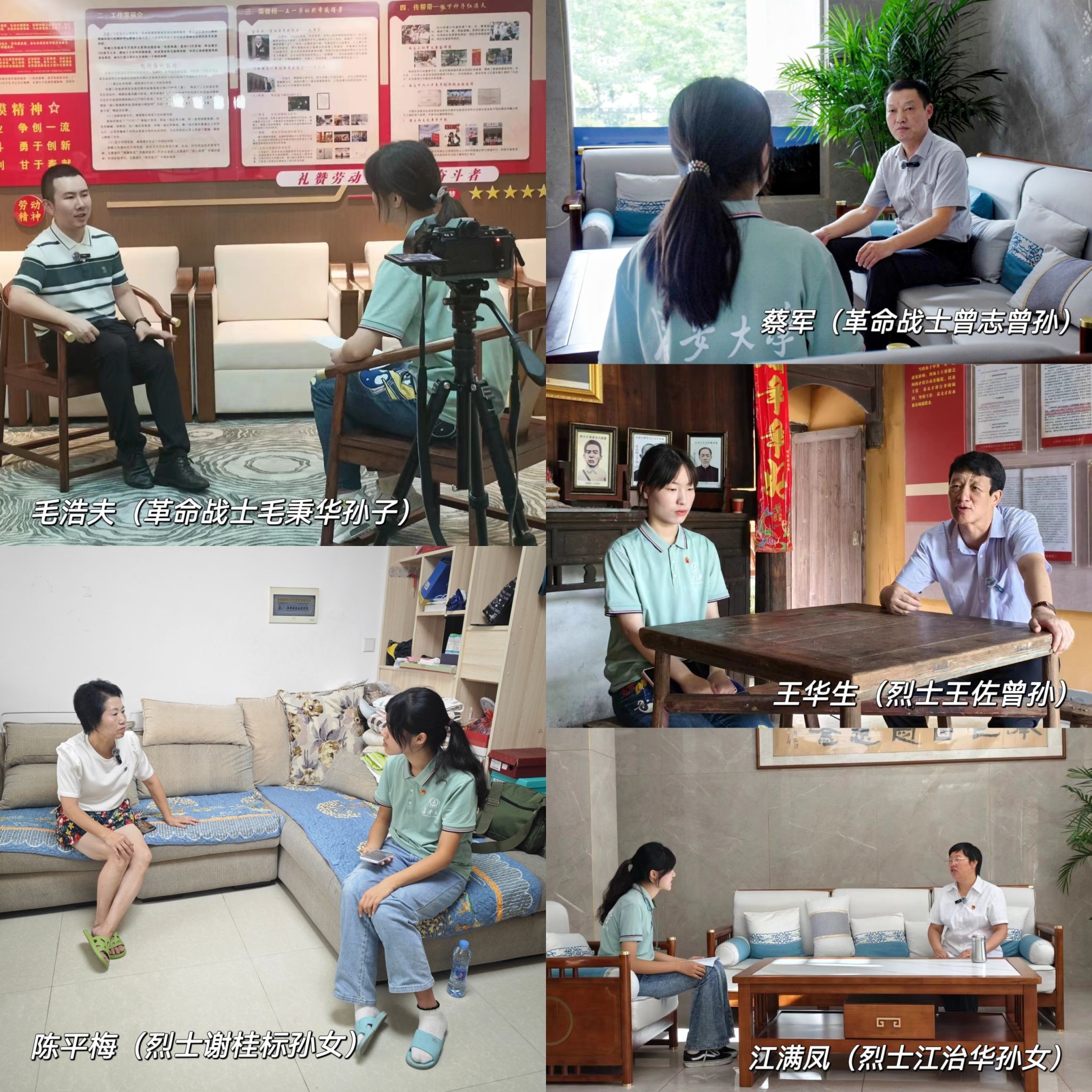 专访革命后代,传承红色基因。为深入挖掘井冈故事、传承红色基因,7月19日至22日,实践队成员分别对江满凤(革命烈士江治华后人)、蔡军(革命战士曾志的曾孙)、毛浩夫(革命战士毛秉华孙子)、王华生(烈士王佐曾孙)、陈平梅(烈士谢桂标孙女)五位革命后代进行专访,收集他们回忆革命前辈们工作、生活、战斗情况的口述史资料,摄制众多珍贵影像资料。