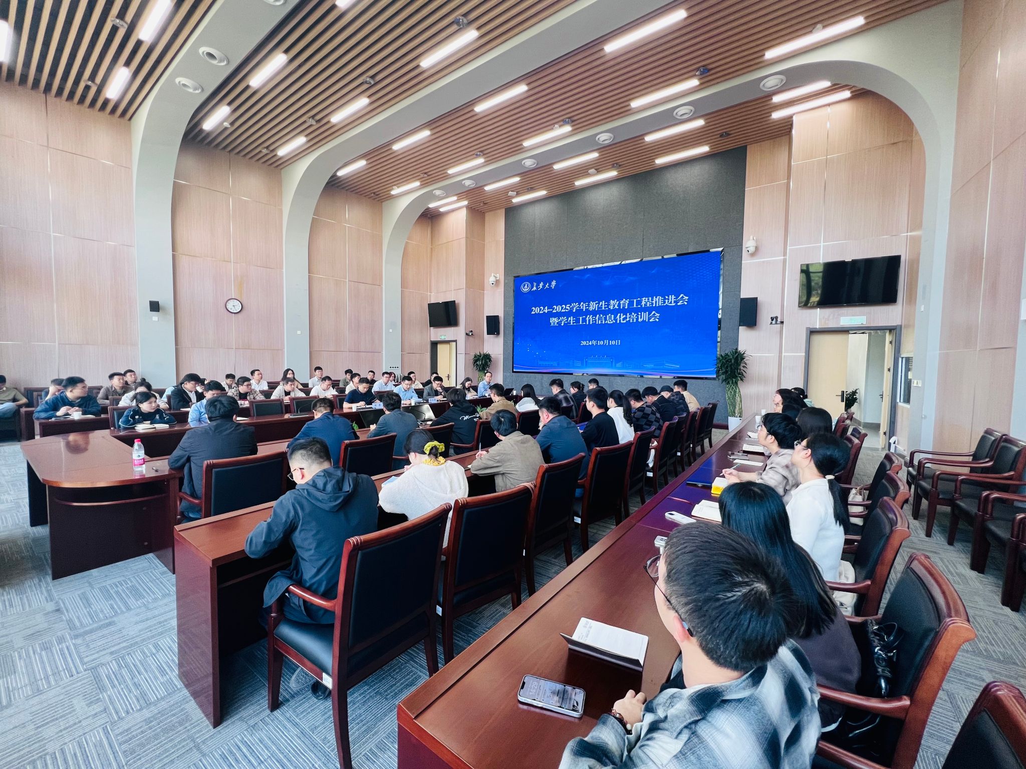 10月10日下午,学校在北校区师生服务大厅召开2024-2025学年新生教育工程推进会暨学生工作信息化培训会。学工部、教务处、校团委等部门相关负责人,各院(系)学办主任、学生工作信息化专干和2024级本科生辅导员参加会议。
