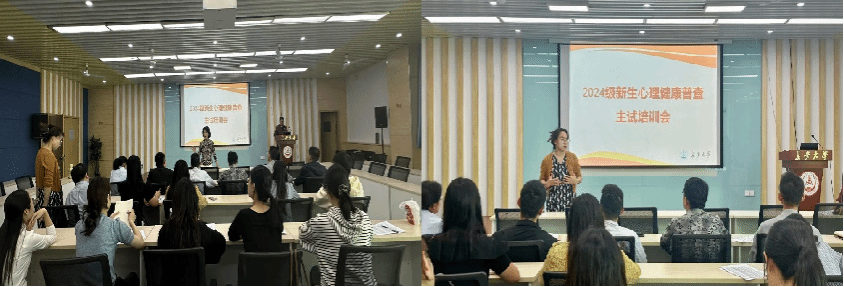 为确保2024级全体新生心理健康测评工作精准高效开展,10月10日、10月11日,心理健康教育与咨询中心分别在南北校区举办两场心理健康普查主试培训会,各院(系)学办主任、全体新生辅导员、心理中心专任教师参加培训。