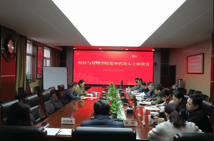 为更好发挥党外人士在学院改革发展中的作用,提升学院民主党派参政议政建言献策的能力,11月28日下午,经济与管理学院在学院一楼会议室召开党外人士座谈会,统战部部长石松、统战部副研究员刘小莉,学院党政领导、全体党外人士参加座谈会,会议由学院党委副书记、副院长、纪委书记龚少博主持。