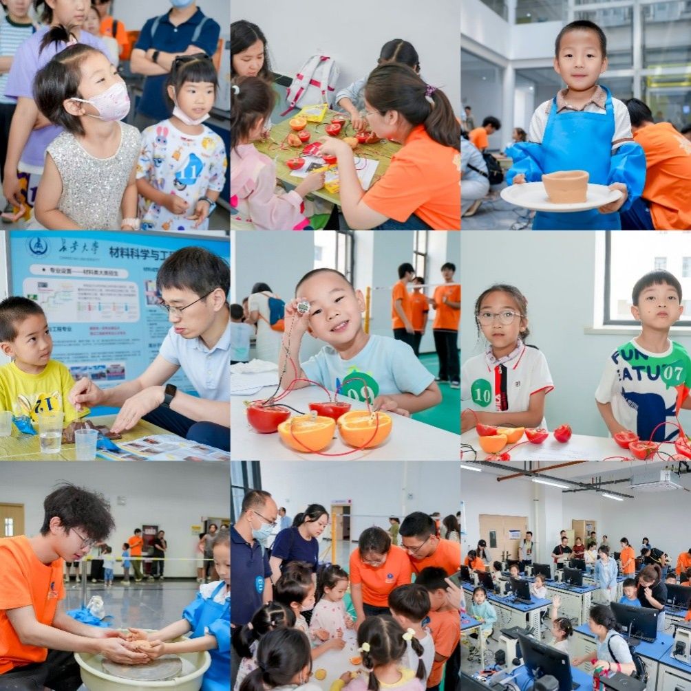 孩子们身着蓝色实验服,在教授、学生志愿者和家长的陪伴下,穿梭于五大主题实验室。活动现场,每一个实验环节都暗含着浓浓的思政深意,陶艺创作中,可再生黏土化作“绿色艺术品”,孩子们捏塑的不仅是陶罐,更是对“生态文明”的初体验;3D打印工坊里,神话人物“哪吒”的风火轮与现代钛合金技术碰撞,传统文化与科技创新的融合悄然扎根;显微镜前,金属晶粒的微观世界揭开面纱,严谨求实的科研精神在孩子们专注的眼神中萌芽。