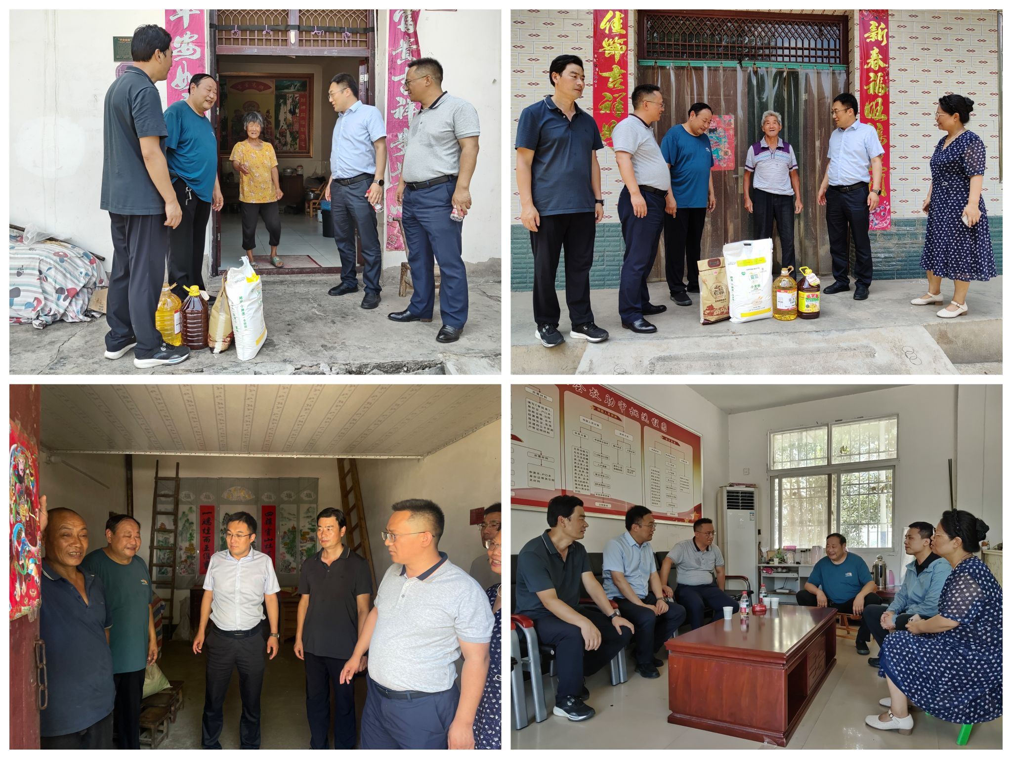 调研途中,学院领导专程走访慰问了5户老党员和困难群众家庭。每到一户,均与村民促膝交谈,关切询问生活境况与健康需求,送上米面油等生活必需物资,将党组织的关怀真切传递到村民的心坎上。在村委会办公室,学院一行与镇、村书记进行了务实高效的座谈交流。双方围绕如何深化党建结对共建、精准对接帮扶需求、拓展校地合作空间等议题展开深入研讨。