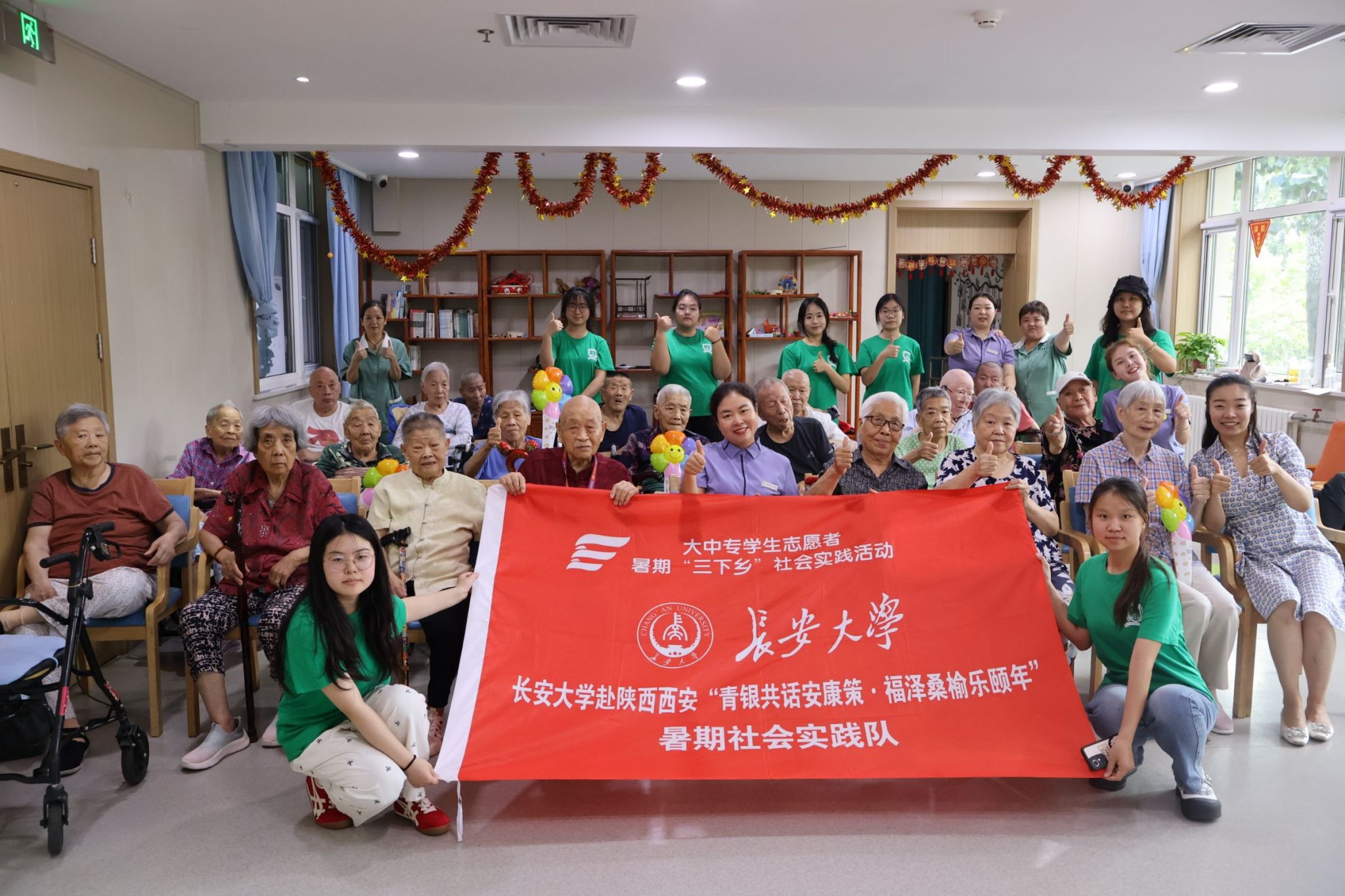 实践队员在西安颐康普惠康养综合服务中心与老人们合影