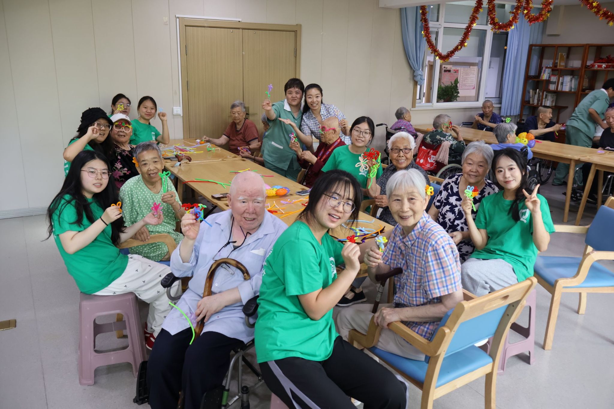 实践队员与西安颐康普惠康养综合服务中心老人们做手工合影留念