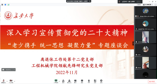 为深入学习宣传贯彻党的二十大精神,11月24日上午,开云kaiyun官网离退休处党总支退休第十二党支部联合工程机械学院领航先锋研究生党支部开展“老少携手 统一思想凝聚力量”专题座谈会,离退休工作处党总支副书记冯鹃、工程机械学院党委副书记雷剑出席会议。会议由领航先锋研究生党支部书记高婷婷主持。