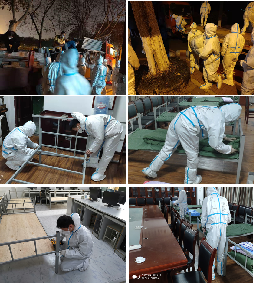 建工学院志愿者在搬运物资、组装整理床铺、卫生清扫