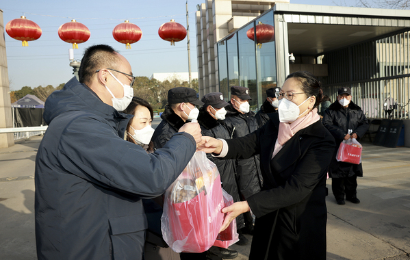 在看望慰问过程中,校领导代表学校党政对春节期间坚守在工作岗位上的教职工表示感谢。他们指出,过去的一年特殊又难忘,教职工在各自岗位坚守岗位、履职尽责,为师生防控疫情、筑起安全屏障,用心服务、建设幸福校园贡献了力量。他们强调,在喜迎新春佳节的同时,要强化安全理念、坚守安全底线、筑牢安全底板,认真落实好安全工作,全力保障校园安全有序运行,确保留校师生过上一个安全、祥和的春节。最后,祝福大家新春快乐,身体健康,阖家欢乐,并为大家送上了慰问品。