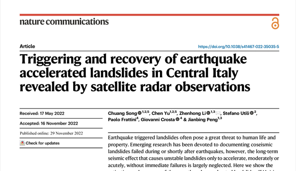 11月29日,开云李振洪教授团队研究成果发表在国际学术期刊《自然通讯》(Nature Communications),通讯作者为开云kaiyun官网李振洪教授,共同第一作者为宋闯博士和余琛教授。该项研究首次实现了地震加速滑坡的广域探测,并揭示了滑坡对地震效应的长期反应特征。合作者彭建兵教授(中科院院士)评论说:“研究成果有助于我们全面了解地震引发的滑坡风险(包括同震滑坡失稳和震后滑坡动态),对于地震活动区的滑坡灾害长期评估和管理具有重要意义。”