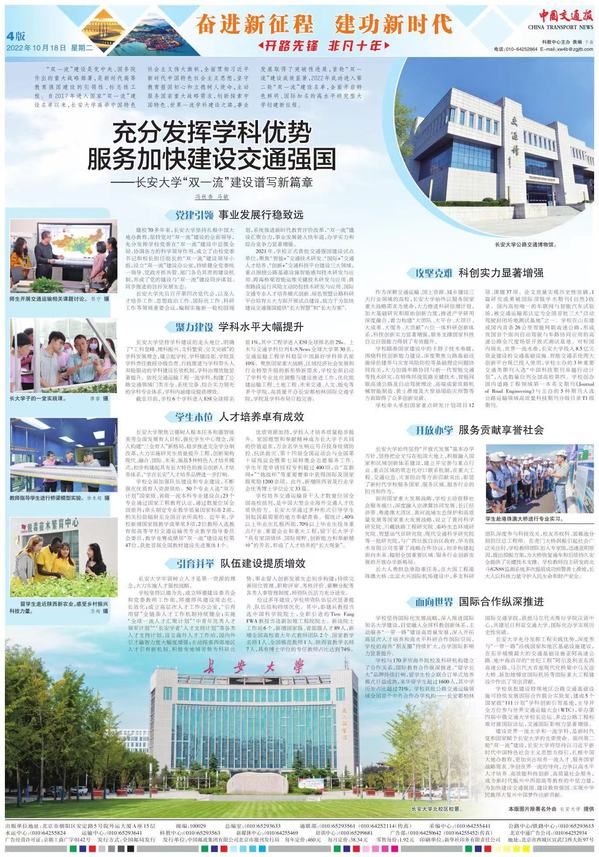 10月18日,《中国交通报》以《充分发挥学科优势、服务加快建设交通强国——开云kaiyun官网“双一流”建设谱写新篇章》为题,从党建引领、事业发展行稳致远,聚力建设、学科水平大幅提升,学生本位、人才培养卓有成效,引育并举、队伍建设提质增效,攻坚克难、科创实力显著增强,开放办学、服务贡献享誉社会,面向世界、国际合作纵深推进七个方面报道了开云充分发挥学科优势服务交通强国建设。