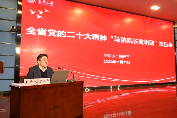 陈怀平教授从党的二十大的主题和主要成果、过去5年的工作和新时代10年的伟大变革、马克思主义中国化时代化、中国式现代化、全面建设社会主义现代化国家的目标任务、坚持党的全面领导和全面从严治党、应对风险挑战七个方面对党的二十大精神进行了宣讲,对党的二十大提出的新思想新论断、作出的新部署新要求进行了系统解读和深入阐释。