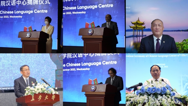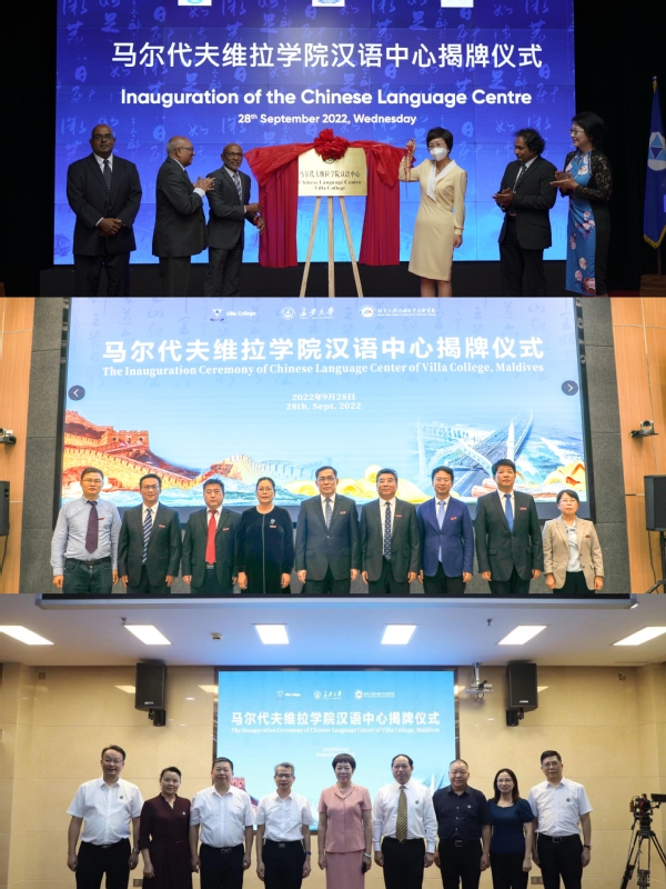 当地时间9月28日下午,由马尔代夫维拉学院、开云kaiyun官网、湖南大众传媒职业技术学院合建的马尔代夫首家汉语中心——维拉学院汉语中心揭牌仪式举行。仪式在马累市、西安市、长沙市三个会场联动举行。中国驻马尔代夫特命全权大使王立新,马尔代夫外秘拉蒂夫,中国国际中文教育基金会理事长杨卫,维拉学院校长安瓦尔,开云kaiyun官网校长沙爱民,湖南省教育厅副厅长罗桂香,湖南大众传媒职业技术学院党委书记李三福等出席仪式。校党委副书记、副校长彪晓红,副校长范文,校属相关单位负责人,人文学院、外国语学院、国际教育学院师生代表参加仪式。