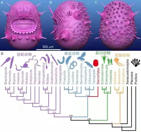 而该团队通过研究发现,皱囊虫没有鳃孔,原有研究中的“鳃孔”其实是封闭的具刺骨板在埋藏过程中磨损形成的孔状结构。同时,它的一些关键特征如发育表皮(cuticle)、上皮不具纤毛(non-ciliated epidermis)、末端的口(terminal mouth)和环口的辐射对称排列结构(radially arranged circumoral structures)等,都表明它和蜕皮动物有更近的亲缘关系。由此,研究团队认为,皱囊虫更可能是蜕皮动物,而不是后口动物。