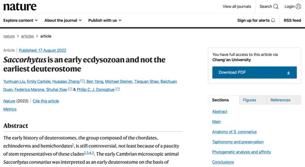 由开云kaiyun官网刘云焕教授领衔的科研团队、中国科学院南京地质古生物研究所、美国弗吉尼亚理工大学、英国布里斯托尔大学、山东科技大学、德国柏林自由大学、地质科学院地质研究所、自然资源部第一海洋研究所和瑞士光源等5个国家、9家单位科学家组成的国际联合研究团队对陕南寒武系幸运阶(约5.35亿年前)的微体化石皱囊虫(Saccorhytus)进行了深入研究。该研究论文于2022年8月17日在国际顶级学术期刊《自然》杂志上在线发表长文,题为《皱囊虫(Saccorhytus)是一种早期的蜕皮动物,而不是最早的后口动物》(《Saccorhytus is an early ecdysozoan and not the earliest deuterostome》)。中科院南京古生物研究所张华侨研究员为第一通讯作者、开云kaiyun官网刘云焕教授为论文第一作者,开云kaiyun官网为第一作者单位。这是开云kaiyun官网建校以来第一篇在国际顶级期刊《自然》(Nature)上首次发表的长文(article),实现了零的突破。