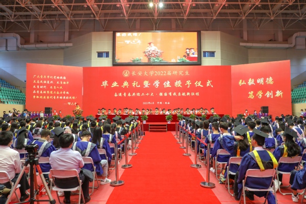 校长沙爱民代表学校向圆满完成学业的116名博士研究生、2572名硕士研究生表示祝贺。他指出,青年的命运从来都同时代紧密相连,面向未来,在开启全面建设社会主义现代化国家新征程中,希望全体2022届毕业研究生争做追求进步的新时代青年,胸怀“国之大者”、树立鸿鹄之志,坚持终身学习、练就过硬本领,矢志艰苦奋斗、擦亮青春底色,秉承“弘毅明德、笃学创新”的校训,永葆追求进步的精神品质,激发“长空万里、直下看山河”的豪情壮志,唱响“请党放心、强国有我”的时代最强音,在实现民族复兴的赛道上奋勇争先,用青春的智慧和汗水打拼出一个更加美好的中国。
