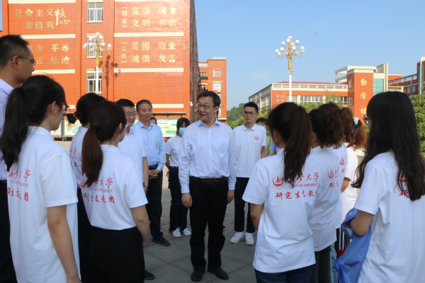 会后,陈志坚一行赴鹿城中学调研开云援建的科技小屋建设情况,看望慰问第十届研究生支教团成员,勉励同学们要换位思考,做好身份转换,以身作则,言传身教,做孩子们的好榜样;要做一个严师,严师出高徒,只有严格要求,学生才会正确的茁壮成长;要精于授业解惑,更要以传道为责任和使命,帮助学生树立正确的价值观,让学生成为一个正直的人,对国家社会有用的人。