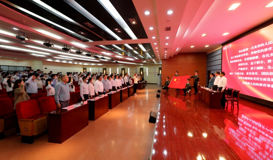 陕西省教书育人楷模、陕西省普通高等学校教学名师仝秋红带领全体新教工面向国旗庄严宣誓。