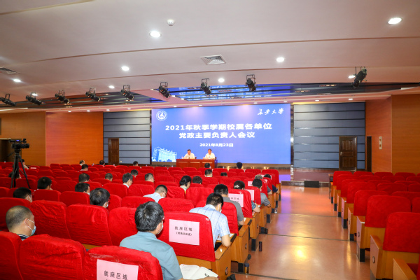 8月23日上午,学校召开2021年秋季开学校属各单位党政负责人会议,深入学习贯彻习近平总书记“七一”重要讲话精神,分析研判新形势新任务,安排部署学校秋季开学党政重点工作。校党委书记陈志坚主持会议并讲话,校长沙爱民总结暑期主要工作并部署下半年重点工作安排。根据疫情防控要求,会议设两个会场。主会场在北校区北辰会议中心二层报告厅,分会场在北辰楼14层第九会议室。