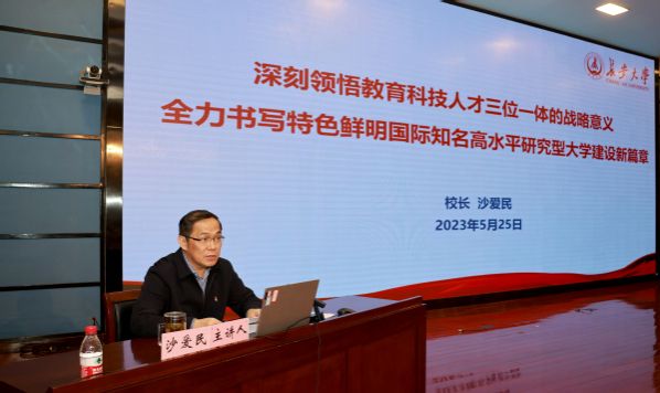 5月25日下午,学校在北校区北辰楼会议中心二层报告厅举办学习贯彻习近平新时代中国特色社会主义思想主题教育专题党课,校长沙爱民以《深刻领悟教育科技人才三位一体的战略意义,全力书写特色鲜明国际知名高水平研究型大学建设新篇章》为题作报告。专题党课由校党委副书记徐引正主持。