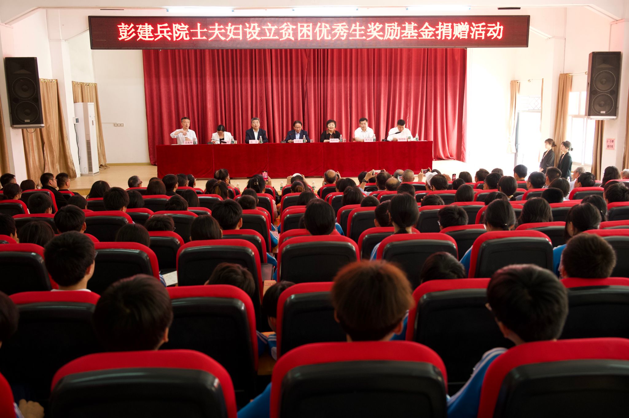 4月22日下午,彭建兵院士携夫人庞桂珍女士向母校张家畈中学捐赠人民币100万元,设立贫困优秀生奖励基金,奖励资助品学兼优的贫困学生,鼓励他们奋发图强、为国家和社会建功立业。范文、刘大锰、麻城市副市长张星及相关专家学者出席捐赠仪式。