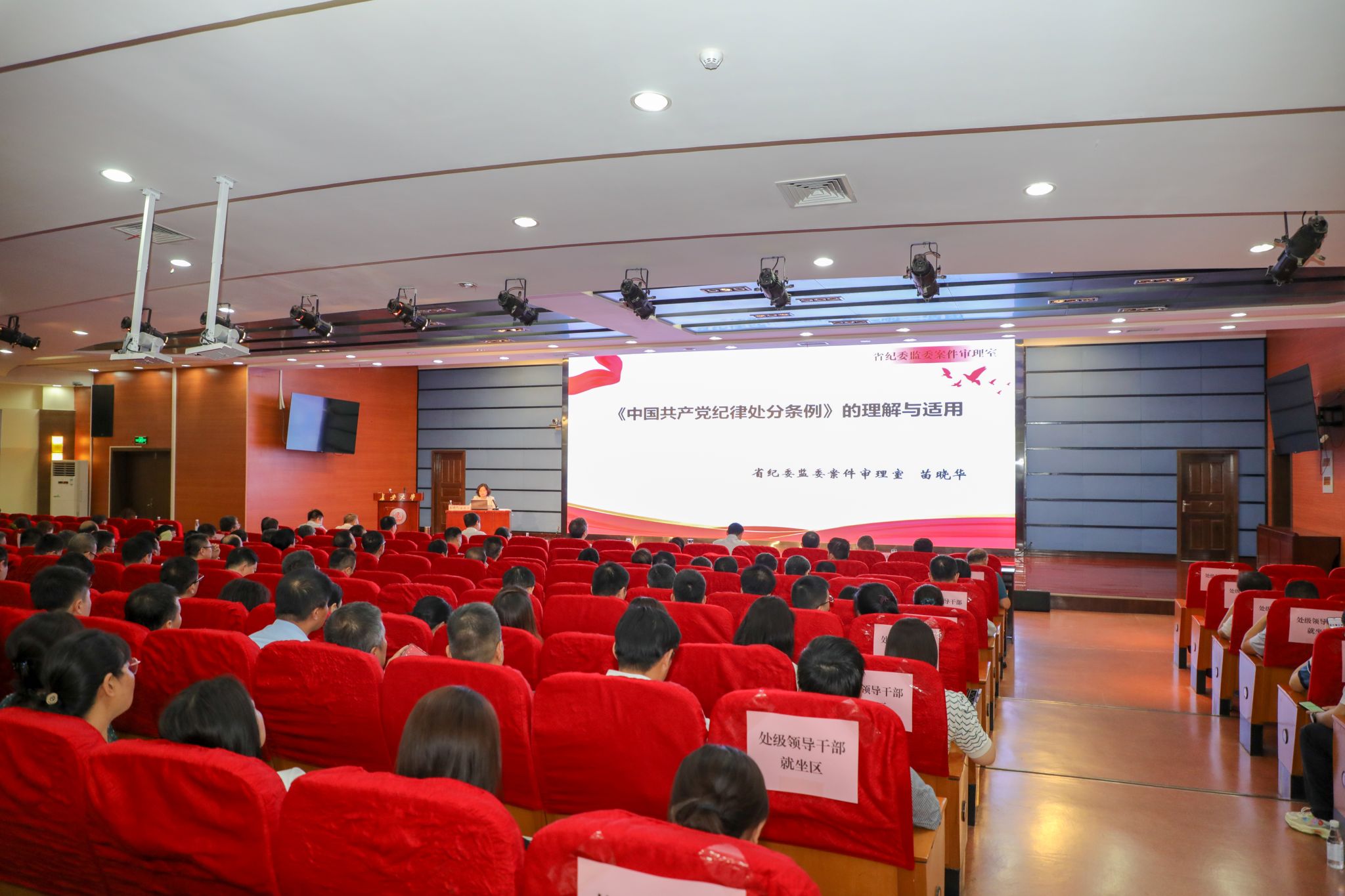 苗晓华以《中国共产党纪律处分条例》的理解与适用为题,阐述了开展党纪学习教育的时代背景、重大意义和重要任务,结合自己多年的工作和研究经验,对新修订的《中国共产党纪律处分条例》作了全面深入的解读和阐释。专题报告内容丰富、阐释精准、深入浅出,既有理论概括、又援引典型案例,引导全体党员干部强化纪律意识,严守纪律规矩,是一堂意义深刻的党纪学习教育课。