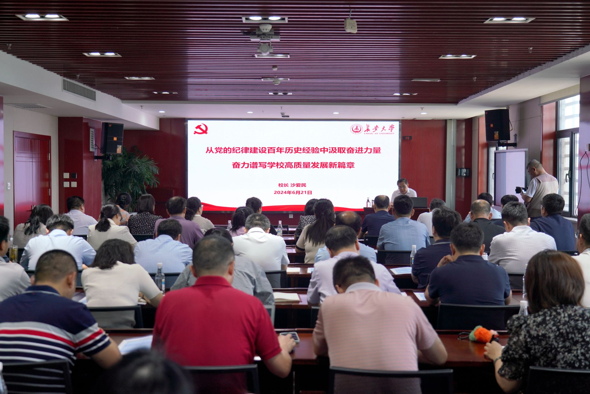 沙爱民以《从党的纪律建设百年历史经验中汲取奋进力量,奋力谱写学校高质量发展新篇章》为题,围绕“中国共产党纪律建设的百年探索及历史经验、深刻把握新时代加强党的纪律建设的重要意义及对高校提出的新要求、切实把党纪学习教育的成果转化为推动学校高质量发展的强大动力”三个方面作报告。