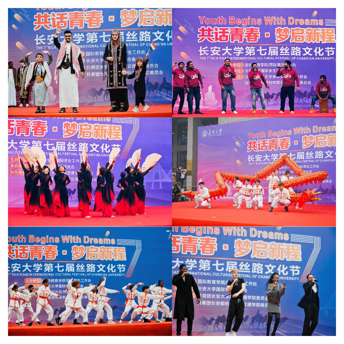 随后,数十名国际学生代表穿着绚丽的民族服装、带着明亮笑容和青春活力亮相舞台,丝路文化节文艺演出拉开序幕。来自世界各国的国际学生与中国学生一起,为观众带来精彩的文艺表演,乐器合奏、歌舞、服装秀等精彩纷呈,迎来台下阵阵喝彩。来自孟加拉国、非洲、中亚和摩洛哥的学生们带来的传统舞蹈活力四射,极具异域风情,来自俄罗斯、刚果(布)、刚果(金)、赞比亚的学生们深情演唱,将现场氛围推向高潮。文艺演出在歌曲《一起向未来》的优美旋律中落下帷幕。