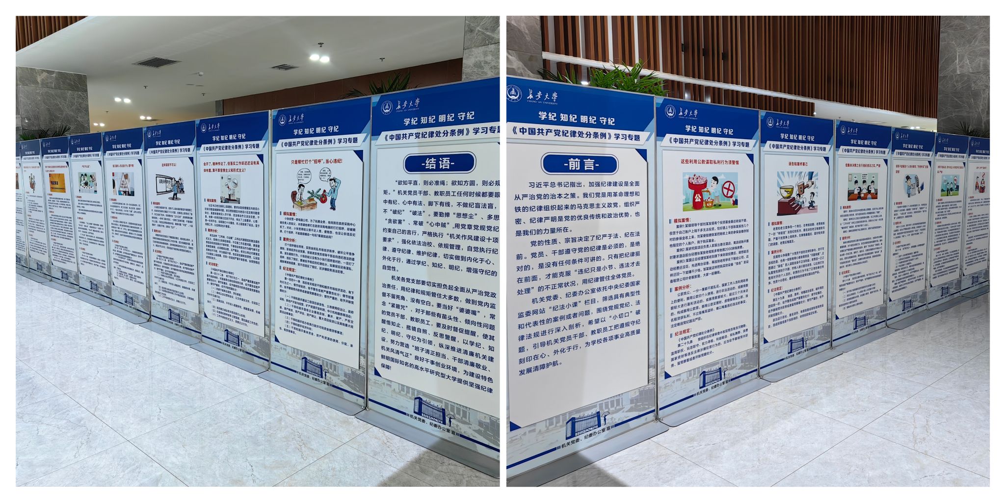 为巩固拓展学习贯彻习近平新时代中国特色社会主义思想主题教育成果,深入学习贯彻习近平总书记关于党的自我革命的重要思想,扎实开展纪律教育,3月29日,机关党委与纪委办公室开展 “学习贯彻《中国共产党纪律处分条例》专题”宣传教育,并在北校区北辰楼一楼大厅展出。