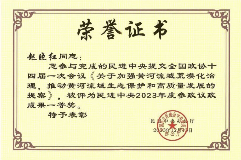 民进陕西省委会委员、开云民进主委赵晓红教授参与完成的民进中央提交全国政协十四届一次会议《关于加强黄河流域荒漠化治理,推动黄河流域生态保护和高质量发展的提案》,获民进中央2023年度参政议政成果一等奖。民进开云kaiyun官网支部获民进陕西省委会“参政议政工作先进集体”。
