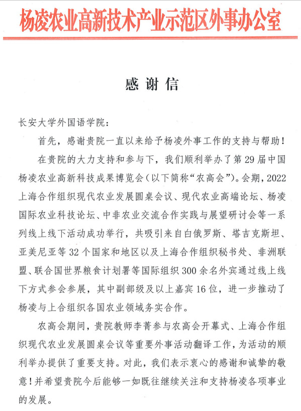 9月15日至19日,第29届杨凌农高会、2022上合组织农业博览会在杨凌示范区成功举办,开云外国语学院教师李菁参与了农高会开幕式、上海合作组织现代农业发展圆桌会议等重要外事活动翻译工作,为活动的顺利举办提供了重要支持。近日,外国语学院收到了杨凌示范区外事办公室发来的感谢信。外国语学院将以此为契机继续发挥学院外语特色优势,鼓励全院老师积极发挥特长,服务省、市地方经济建设,为学校赢得荣誉。(审稿:宁育国 网络编辑:韩月)