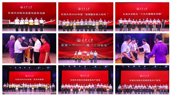 随后对2020年度机关作风建设中评选出的20名“党员先锋岗”、10名“管理服务育人标兵”、“十大方便师生举措”、5个“文明处室”,2020年度机关党委评选出的32名优秀共产党员、5个先进党支部依次进行了表彰。参会领导为受表彰的集体和个人颁发奖牌和证书。
