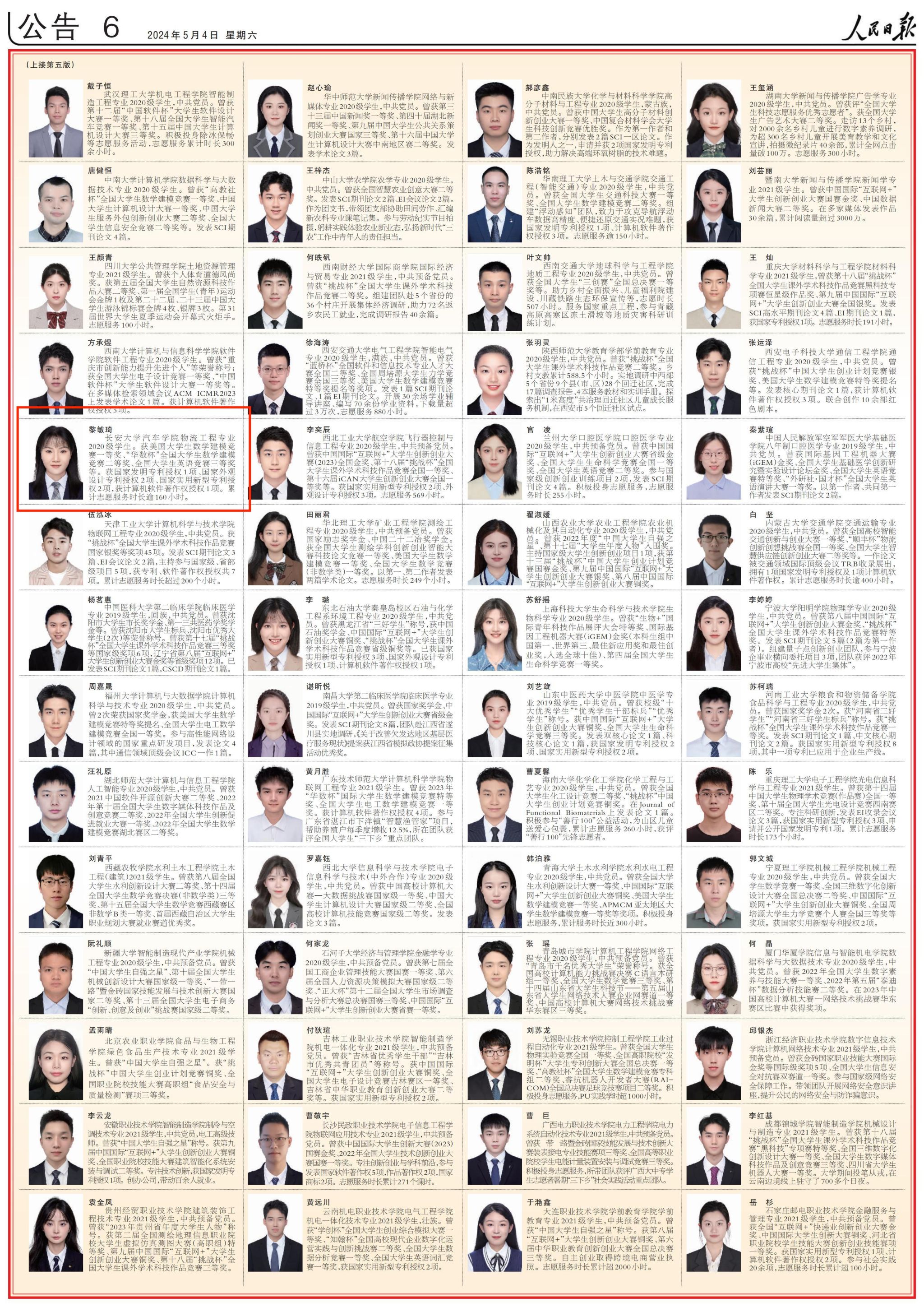 近日,《人民日报》专版刊登《2022—2023学年度本专科生国家奖学金获奖学生代表名录》《2022—2023学年度研究生国家奖学金获奖学生代表名录》,开云汽车学院物流工程专业2020级本科生黎敏琦、公路学院桥梁与隧道工程专业2020级博士研究生陈柯帆入选名录,这是开云本科生近五年连续荣登《人民日报》本专科生国家奖学金获奖学生代表名录,研究生连续两年入选研究生国家奖学金获奖学生代表名录。