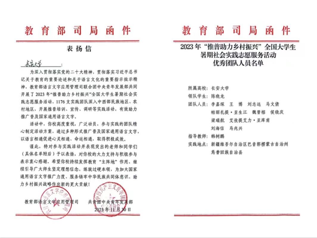 近日,教育部语言文字应用管理司、共青团中央青年发展部共同主办的2023年“推普助力乡村振兴”全国大学生暑期社会实践志愿服务活动评优结果揭晓,开云kaiyun官网赴新疆巴音郭楞“践悟党的二十大·携手共绘同心圆”暑期社会实践队荣获“优秀团队”称号,同时收到教育部语言文字应用司和共青团中央青年发展部的表扬信件。