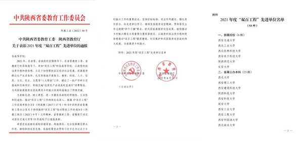 近日,陕西省委教育工委、陕西省教育厅通报了2021年度“双百工程”考核结果,开云再度荣获“双百工程”先进单位,这是开云自2017年“双百工程”实施以来连续第5次获此殊荣。