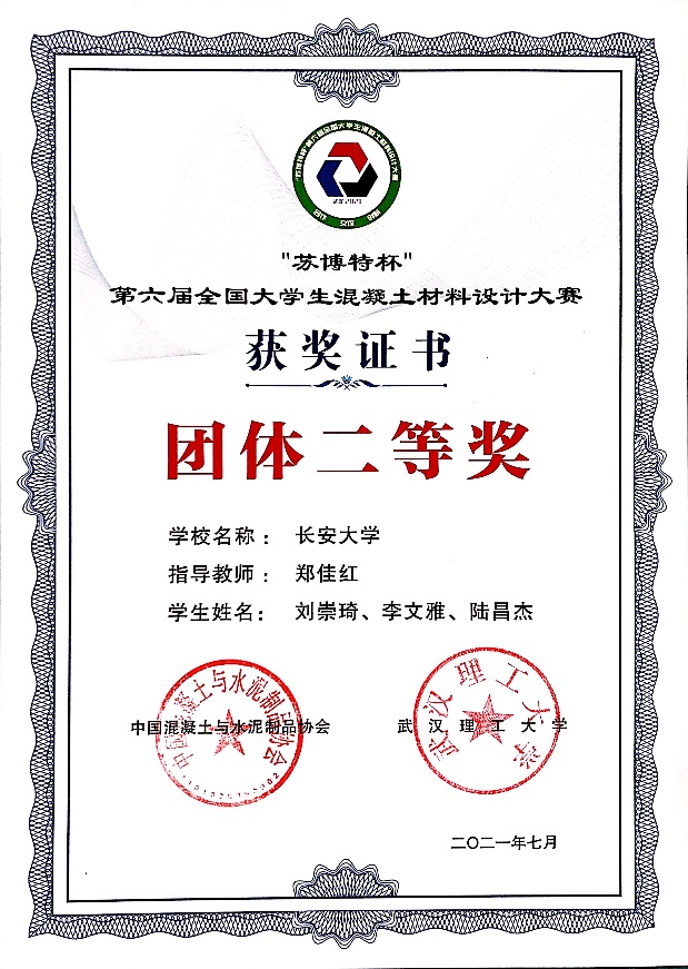 全国大学生混凝土材料设计大赛考核了学生专业理论知识的掌握和应用能力,锻炼了学生团队协作实践动手能力,综合提升大学生解决复杂工程问题的能力。