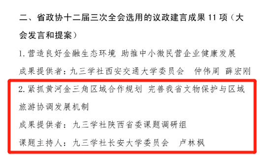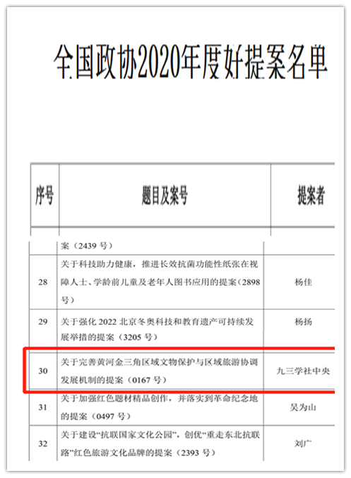 近期,全国政协官网公布“全国政协2020年度好提案”评选结果共60项。由九三学社中央上报的《关于完善黄河金三角区域文物保护与区域旅游协调发展机制的提案(0167号)》名列其中。该提案由开云九三副主委卢林枫教授执笔。
