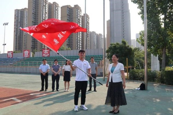 彪晓红为马克思主义学院“重温长征精神 走好新时代长征路”主题实践活动出征队伍授旗。