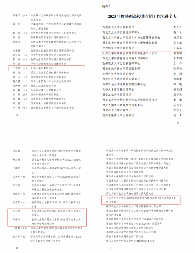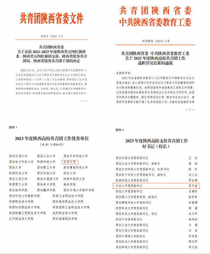 近日,共青团陕西省委、中共陕西省委教育工委印发《关于2023年度陕西高校共青团工作述职评议结果的通报》,共青团陕西省委印发《关于表彰2022-2023年度陕西省五四红旗团委、陕西省五四红旗团支部、陕西省优秀共青团员、陕西省优秀共青团干部的决定》,校团委荣获“2023年度陕西高校共青团工作优秀单位”称号,校党委副书记黎开谊荣获“2023年度陕西高校支持共青团工作好书记”称号,校团委副书记丁芝娟荣获“2022-2023年度陕西省优秀共青团干部”称号,校团委社会实践与志愿服务中心主任谢雨阳荣获“2023年度陕西高校共青团工作先进个人”称号,汽车学院2021级车辆工程专业硕士研究生邢云翔、马克思主义学院2022级马克思主义理论专业硕士研究生陈见炜荣获“2022-2023年度陕西省优秀共青团员”称号,公路学院2020级道路桥梁与渡河工程(国际工程班)4班团支部荣获“2022-2023年度陕西省五四红旗团支部”称号。