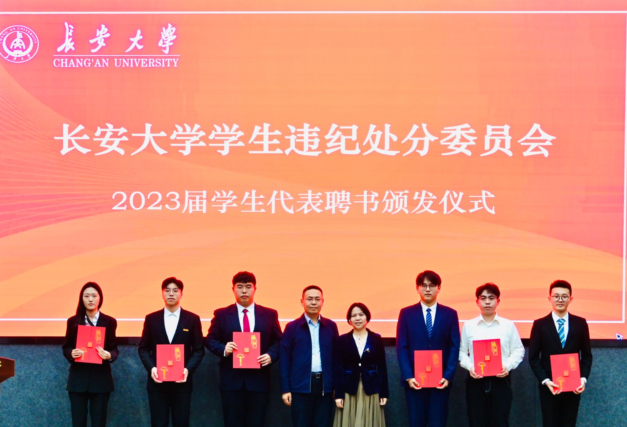 会上,姬国斌、张艳萍为2023届学生违纪处分委员会学生代表颁发聘书,违纪处分委员会学生代表作表态发言。